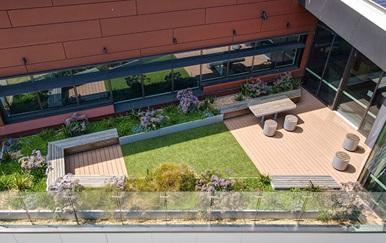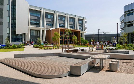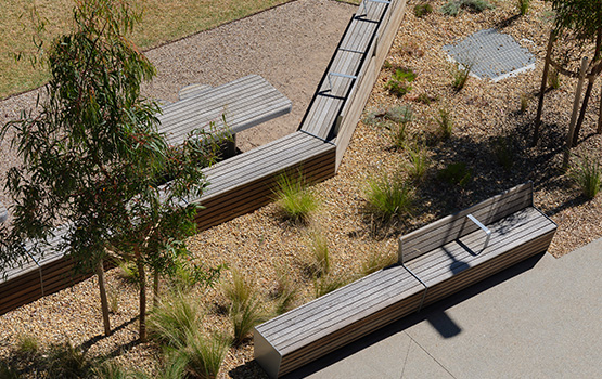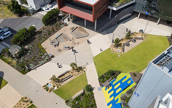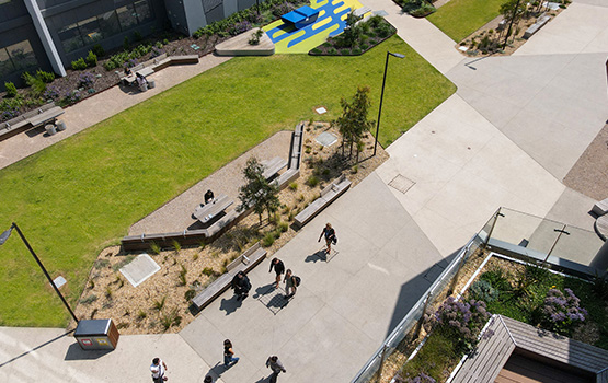 The landscape and open space surrounding the Stage Two building has expanded the campus heart, creating a dynamic outdoor hub for socialising, learning and connections, with a diversity of spaces and improved pedestrian permeability, set within a landscape narrative reminiscent of the precolonial natural landscape.