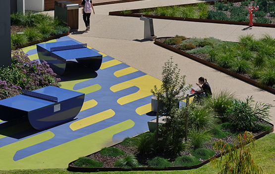 The central open lawn is embraced for informal socialisation, relaxation and student events while the table tennis tables encourage physical sports activity and a flexible sport surface, with the sand dune inspired super graphic offers adaptability.