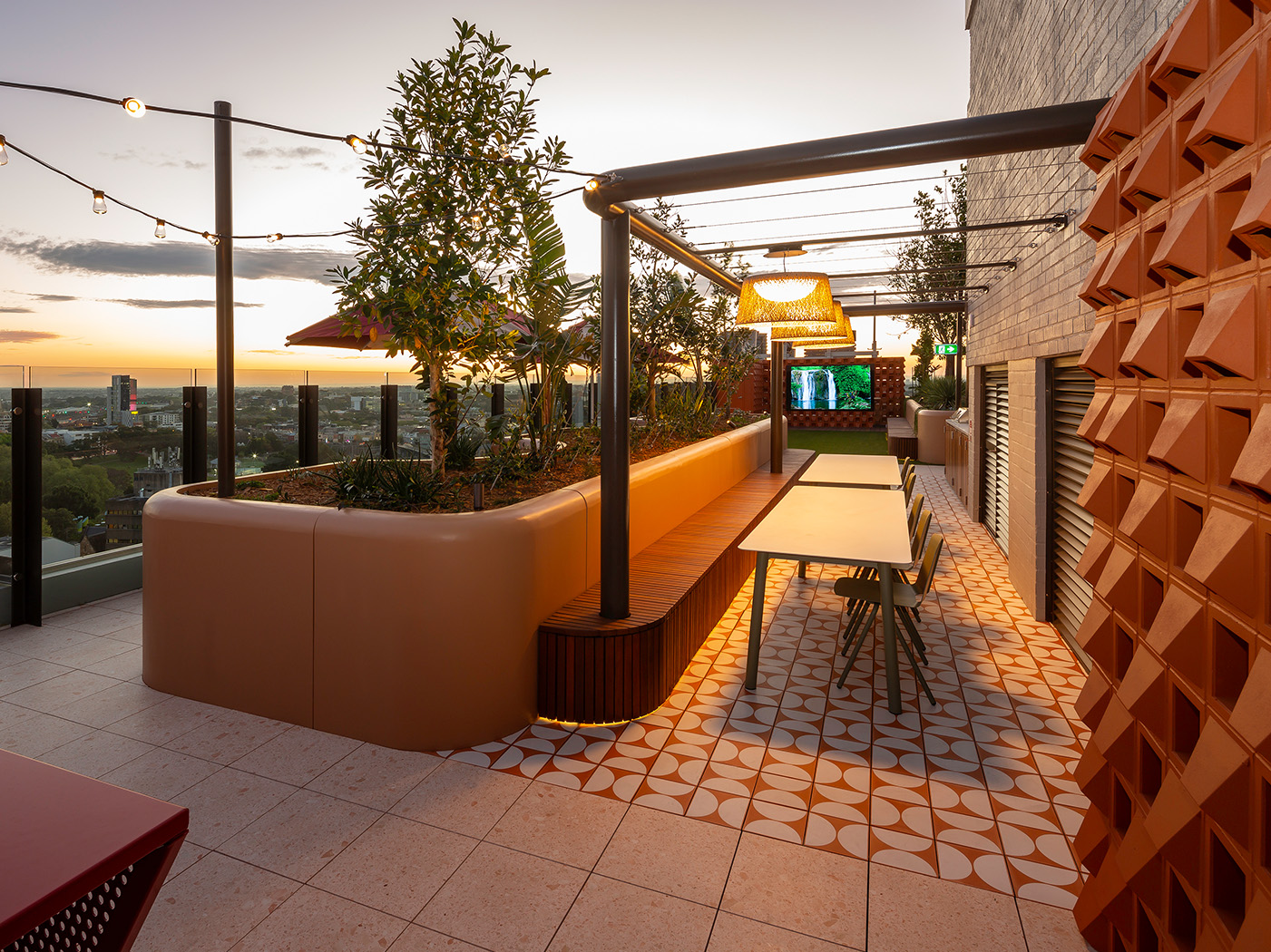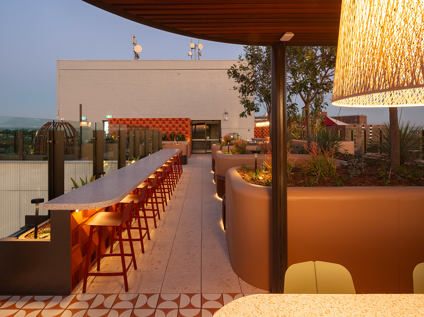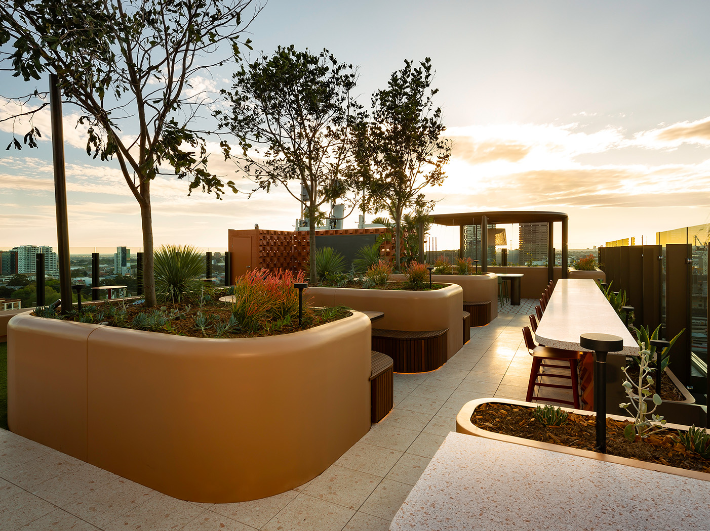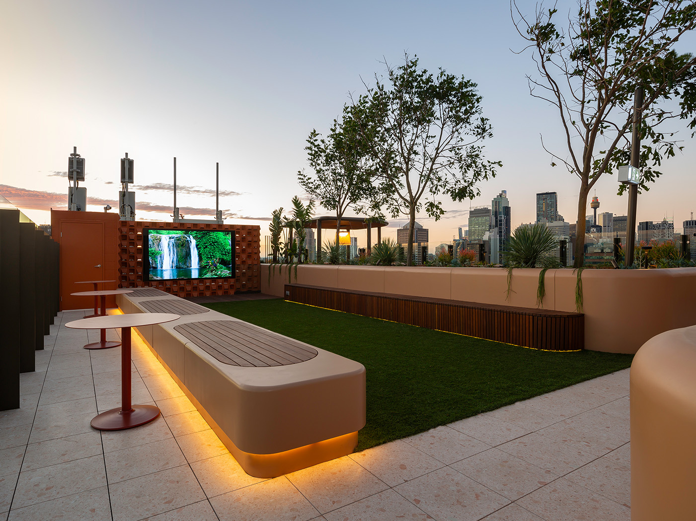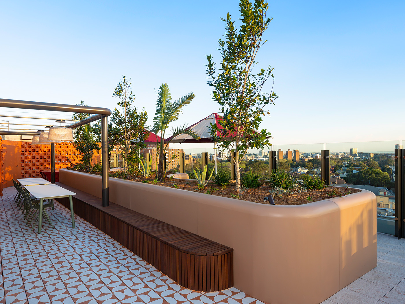 Arcadia has reimagined the rooftop at 418A Elizabeth Street to create outdoor spaces that encourage human interaction, inspire creativity, and facilitate collaboration. The extensively planted rooftop aims to reconnect people with nature by enhancing canopy coverage and promoting biodiversity, establishing a new habitat for birds and bees.