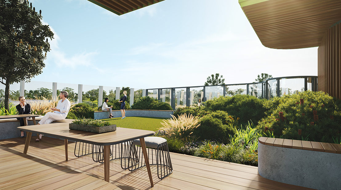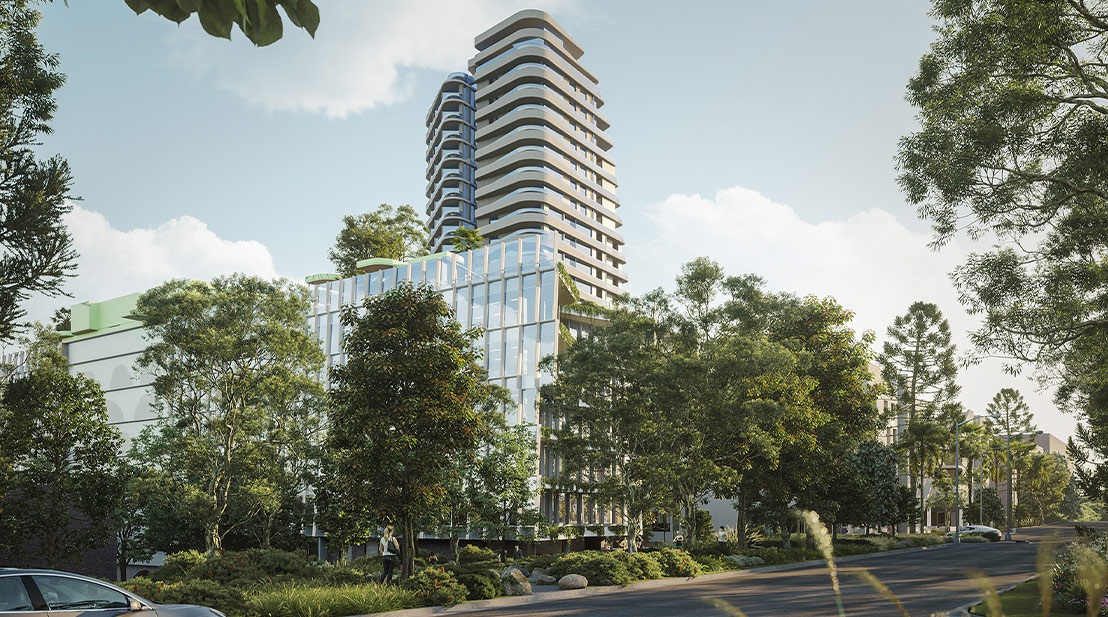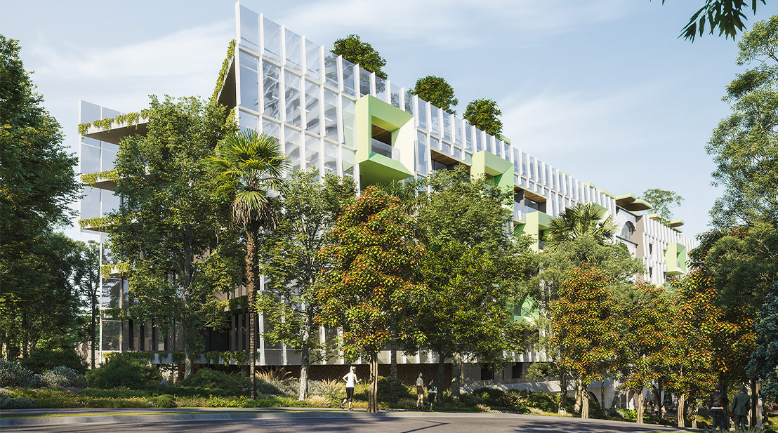 The landscape will complement architecture design and intent, blurring lines between built form and the landscape, with greenery incorporated into building facades and views the retention of connections to existing native vegetation. 2300m2 of native buffer planting will restore native vegetation communities and habitat for Indigenus species, with 100 new trees and established tree canopies will cover up to 45% of the total site area.