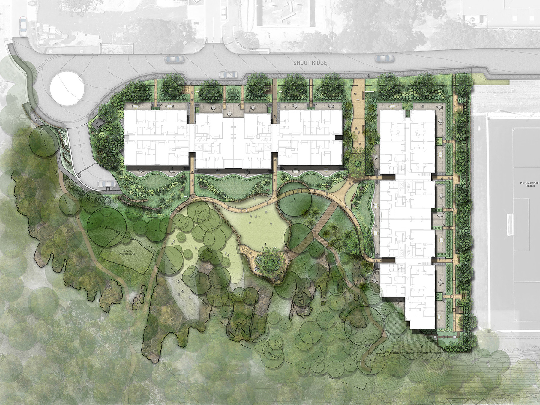 Shout Ridge is a residential development in the Defence Housing Australia (DHA) Crimson Hill precinct at Lindfield, comprising of 88 apartments in two buildings.